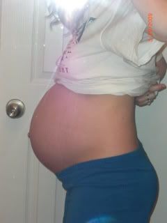 so on with the update Paisleys heart rate was 154- first time she has fit the old wives tale of being a girl the ENTIRE pregnancy, my fundal (top of pubic bone to top of uterus) was 31.5 so thats good, her legs are out of her face which i knew cause she has appendages sticking out every where LOL and i'm up another 5 lbs, which OFFICIALLY puts me at 1 lb below what I delivered Carrson at....eek, lets face it i know i can afford the weight but its going everywhere except my stomach! my butt, my upper thighs, my back-HELLO love handles haha we'll see what decides to stick around after I have her, but I'm not worried about what does decide to stick around, its been nice people not looking at me thinking i'm either a crack addict or an anorexic...people think they can just ask you anything ugh!